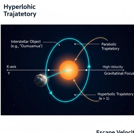 En astronomie, on parle de trajectoire hyperbolique lorsquâun objet traverse un systĂšme stellaire sans jamais y rester. Sa vitesse est si Ă©levĂ©e quâelle dĂ©passe lâinfluence gravitationnelle de lâĂ©toile centrale. Contrairement aux planĂštes ou aux comĂštes classiques, il ne dĂ©crit pas une orbite fermĂ©e : il arrive, frĂŽle, puis disparaĂźt. Une bonne analogie consiste Ă imaginer un caillou lancĂ© trĂšs fort prĂšs dâun aimant : sâil va trop vite, lâaimant nâa tout simplement pas le temps de lâattirer.