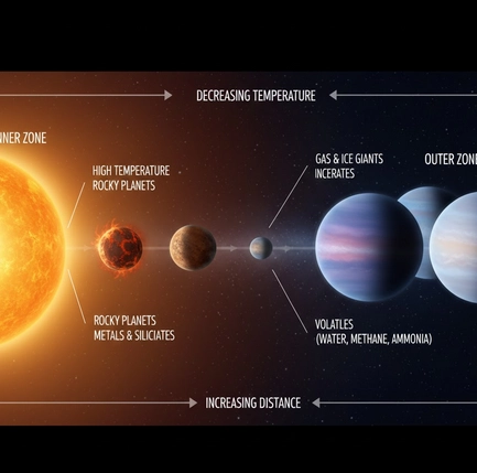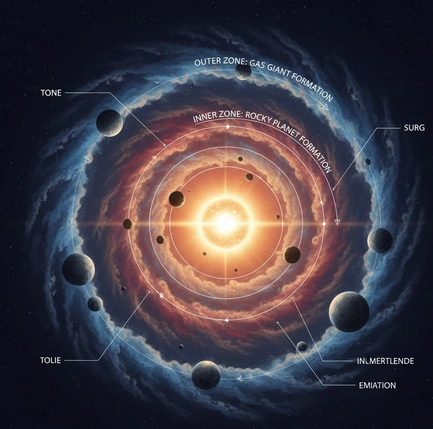 Autour du jeune Soleil, un disque protoplanétaire se met en place, comparable à un immense anneau de matière en rotation. Ce disque n’est pas uniforme : sa structure varie selon la distance à l’étoile, la température et la densité. Plus on se rapproche du centre, plus la chaleur est intense, ce qui empêche certains matériaux de se condenser. À l’inverse, dans les zones plus éloignées, les particules solides survivent plus facilement et s’accumulent progressivement.