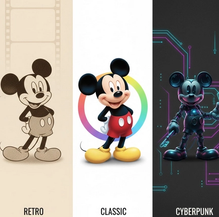 Mickey Mouse nâa jamais Ă©tĂ© figĂ© dans le temps, et cette dĂ©clinaison le prouve une nouvelle fois. Le concept repose sur une idĂ©e forte : montrer comment une mĂȘme icĂŽne peut traverser les Ă©poques sans perdre son ADN. Ici, chaque version agit comme une couche logicielle diffĂ©rente, toutes basĂ©es sur le mĂȘme noyau symbolique, mais adaptĂ©es Ă des sensibilitĂ©s visuelles et culturelles distinctes.